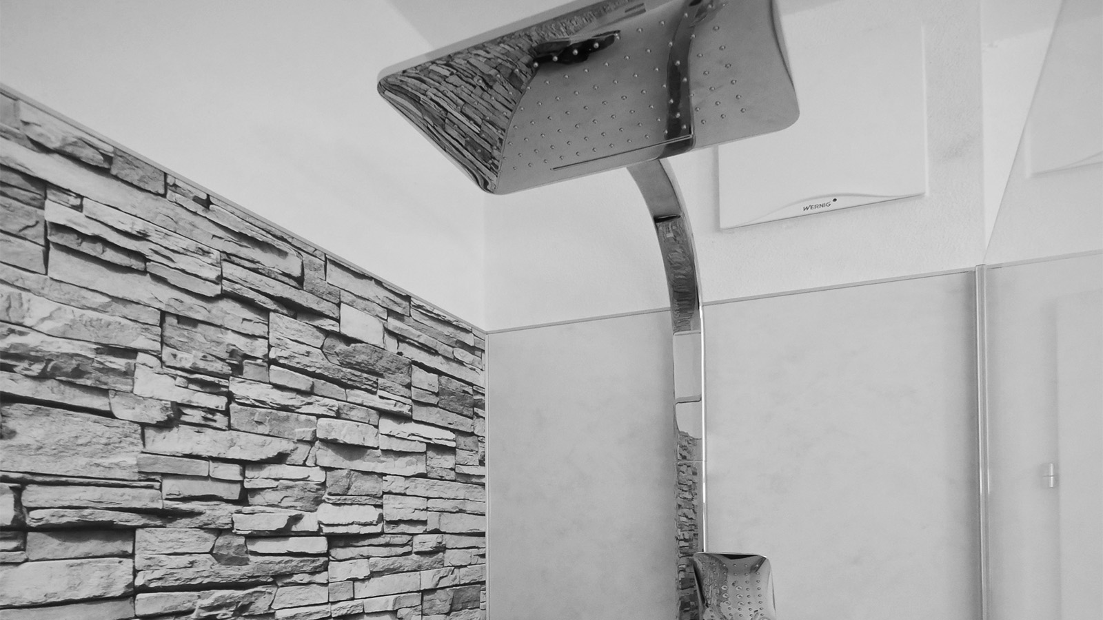 Wandpaneele im modernen Dekor und ohne Fugen freuen das Auge und die Putzfee. Durch die großzügige Ablage auf dem Thermostat-Duschsystem erspart man sich zudem den Duschkorb.