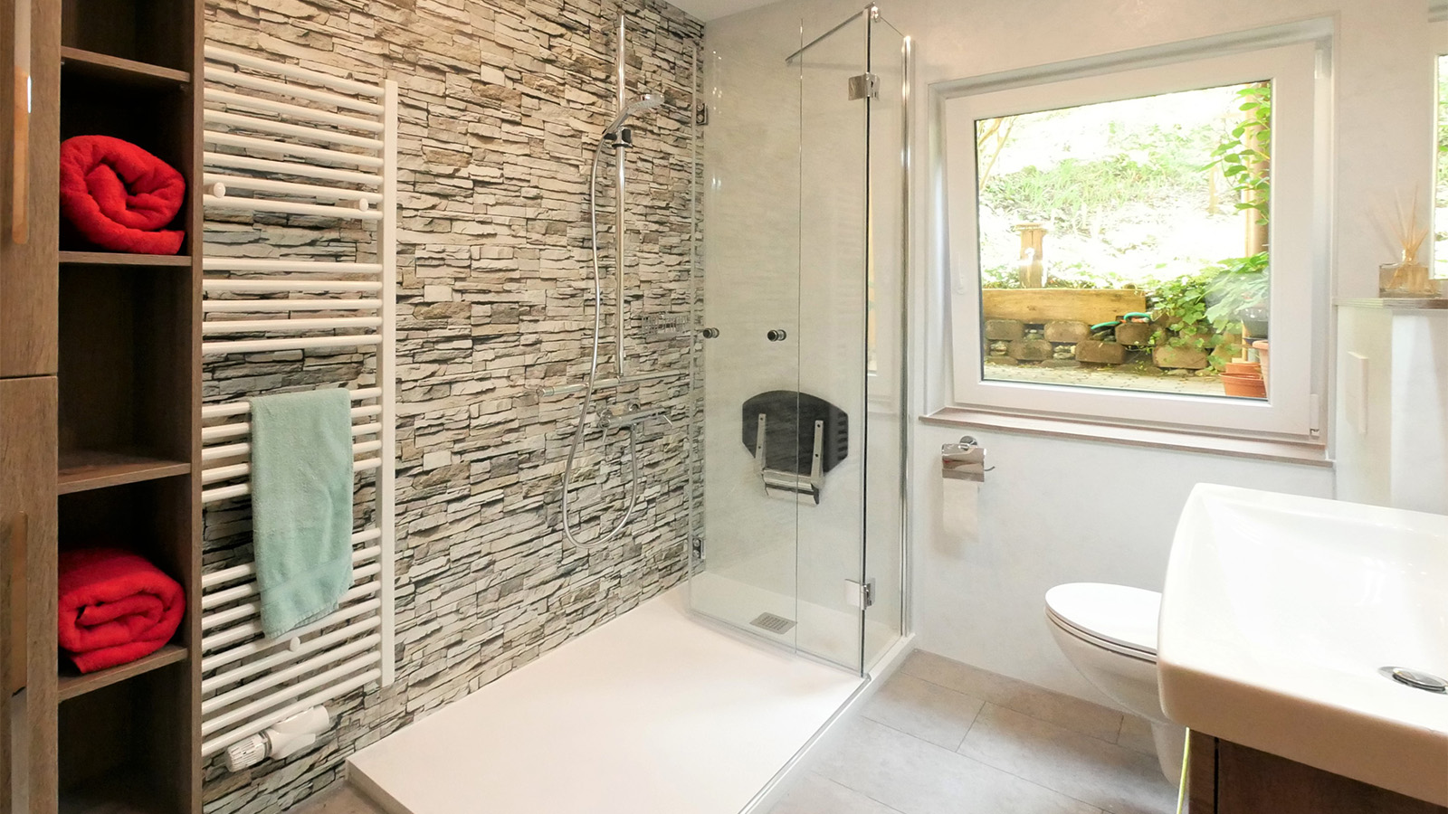 In diesem Bad wurde der Platzt optimal ausgenutzt. Dezente WC-Integration, ein hübsches Waschmöbel mit Spiegelschrank und eine Top-Beleuchtung mit LED-Spots sorgen für Freude und viel Helligkeit. Rutschhemmende Dusche mit Drehfalt-Duschtür.